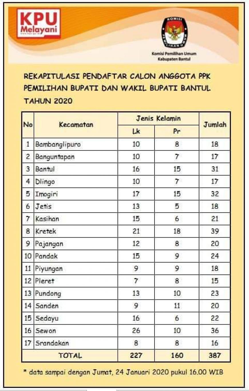 Ngestiharjo (24/01) Jumat 24 Januari 2020 merupakan hari terakhir pendaftaran calon anggota PPK Kecamatan di KPU Kabupaten Bantul. Berdasarkan hasil rekapitulasi pendaftaran calon anggota yang Tim SID Desa Ngestiharjo peroleh dari laman KPU Bantul.