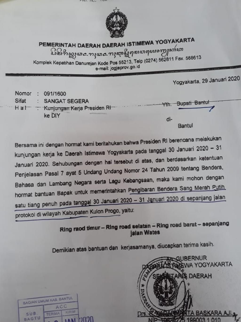 Ngestiharjo (30/01) Berdasarkan surat nomor 091/1600 mengenai Kunjungan Kerja Presiden RT ke DIY maka di mohon warga yang berada di wilayah jalan Wates untuk memasang Bendera Sang Merah Putih.