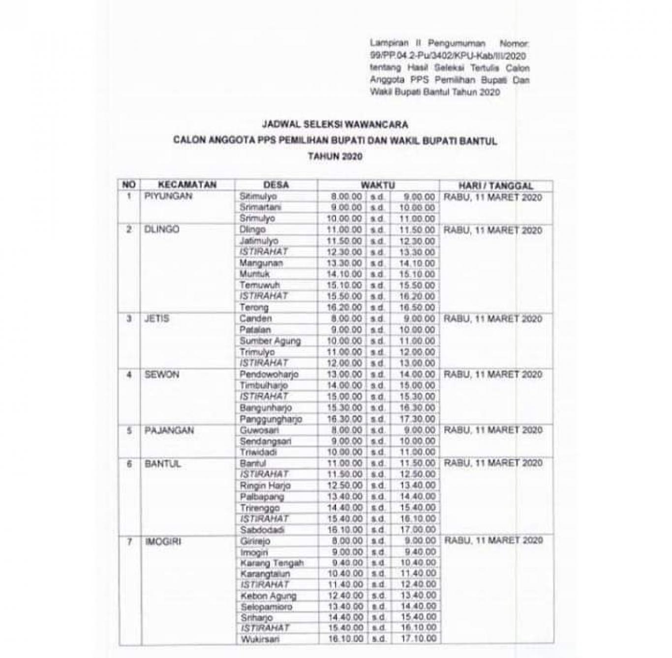 Ngestiharjo (10/3) Berikut jadwal pelaksanaan tes wawancara PPS oleh KPU Bantul.