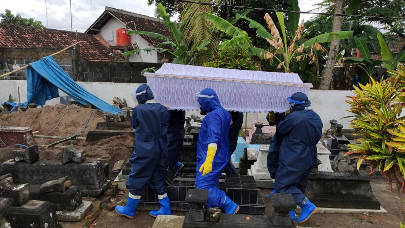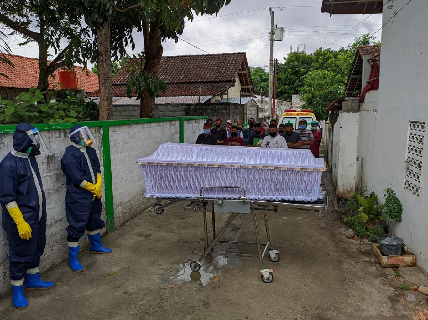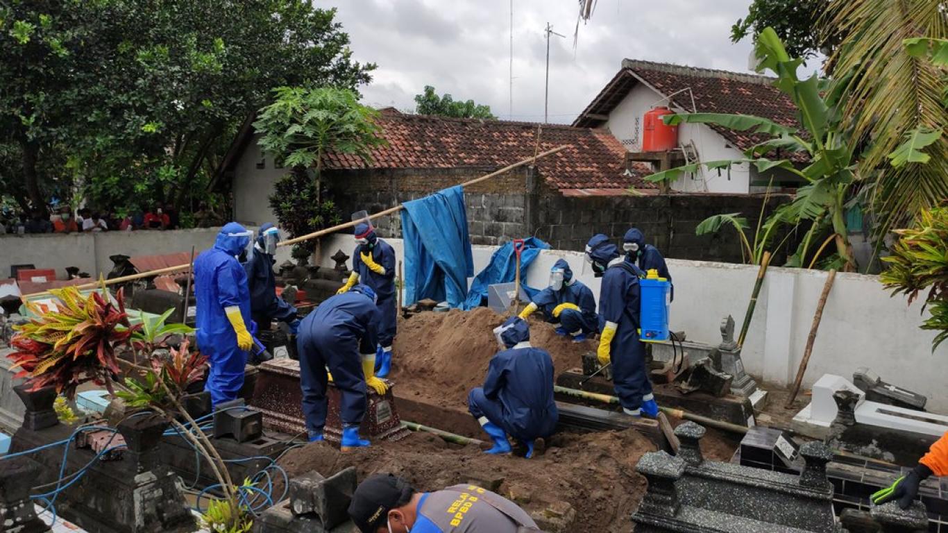 Jenazah berangkat dari RSUD Murangan Sleman sekitar pukul 11.00 WIB dan sampai di Makam Siti Suci Sumberan pukul 11.40. Jenazah kemudian disholatkan oleh keluarga dekat dan warga sekitar namun diberi jarak demi keselamatan. Selesai disholatkan, jenazah dibawa tim relawan pemakaman ke liang lahat dengan hati-hati. Penyemprotan peti jenazah terus dilakukan sambil tim relawan membawa peti ke liang lahat. Prosedur ini wajib dilakukan untuk menghindari penyebaran penyakit infeksius. Relawan juga turut mengubur peti.