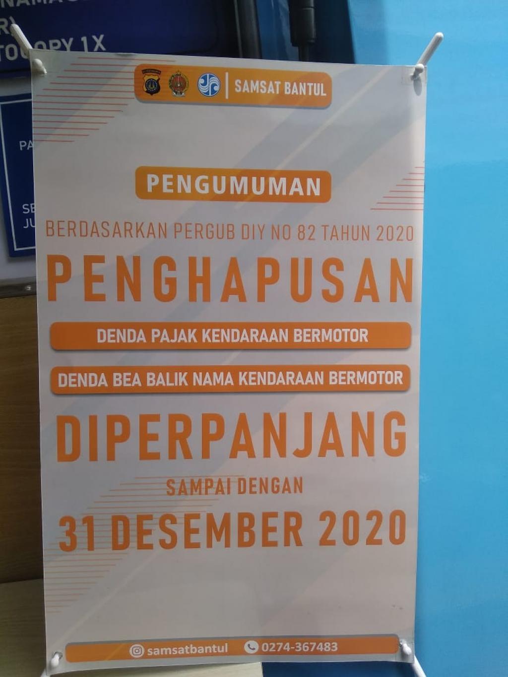 Pada pelayanan hari Sabtu ini di informasikan kepada masyarakat tentang Peraturan Gubernur DIY Nomor 82 Tahun 2020 tentang penghapusan dengan pajak kendaraan bermotor dan dengan bea balik nama kendaraan bermotor diperpanjang sampai dengan 31 Desember 2020