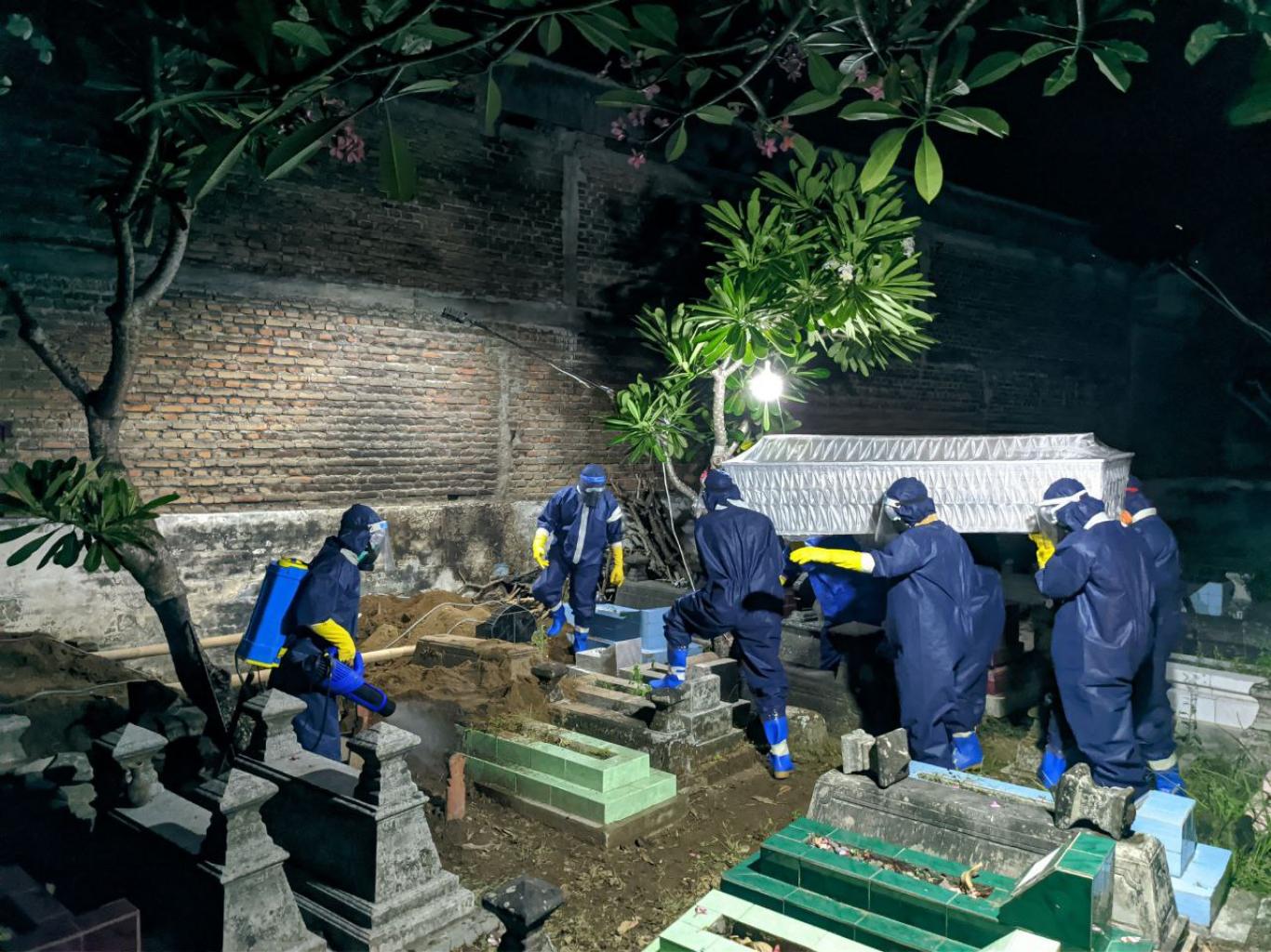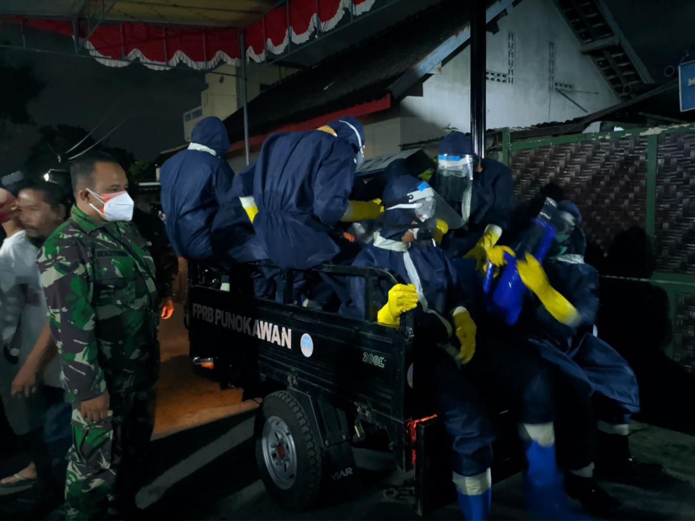 Selesainya penguburan, relawan kemudian melakukan dekontaminasi dan mandi di Kantor Kalurahan Ngestiharjo.