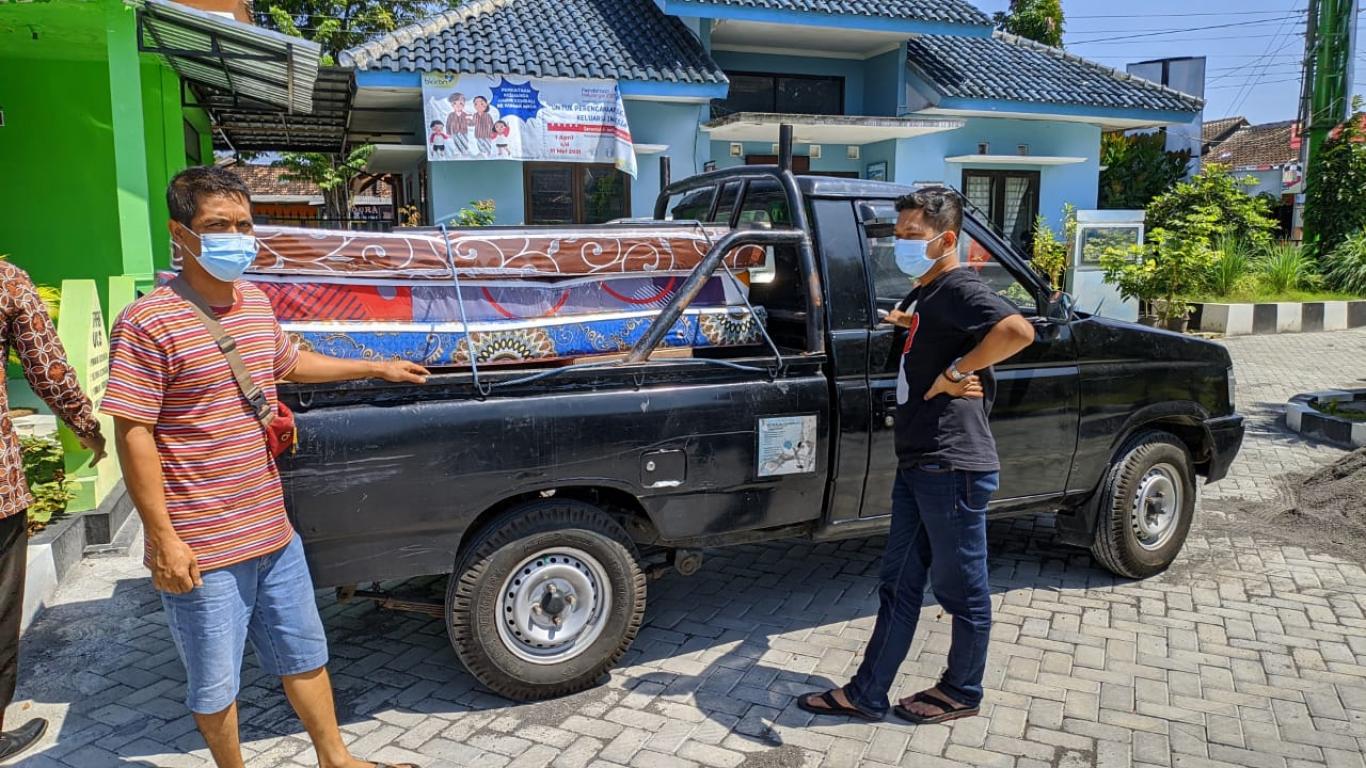 Tirtonirmolo (29/4) Carik Ngestiharjo beserta relawan FPRB Punokawan mengambil bantuan Shelter di Kapanewon Kasihan. Bantuan berupa kipas angin, dispenser, galon air, almari plastik, kasur dan bantal.