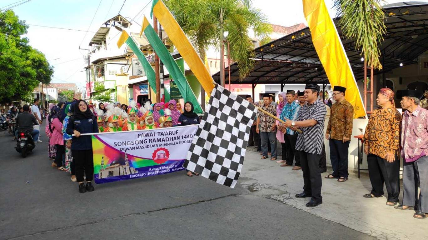 Lurah Desa Ngestiharjo mengibarkan bendera tanda pawai sudah di mulai. Pawai Taaruf Songsong Ramadhan ini dihadiri sekitar 150 personil warga Sidorejo dengan rute sekitar Pedukuhan Sidorejo.