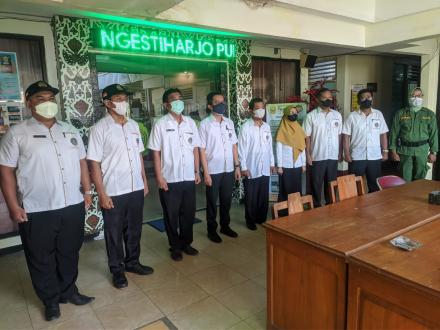 Ngestiharjo (23/03) Pamong Kalurahan Ngestiharjo tepat pukul 08.00 WIB menyanyikan Lagu Kebangsaan Indonesia Raya sebelum pelayanan dimulai.