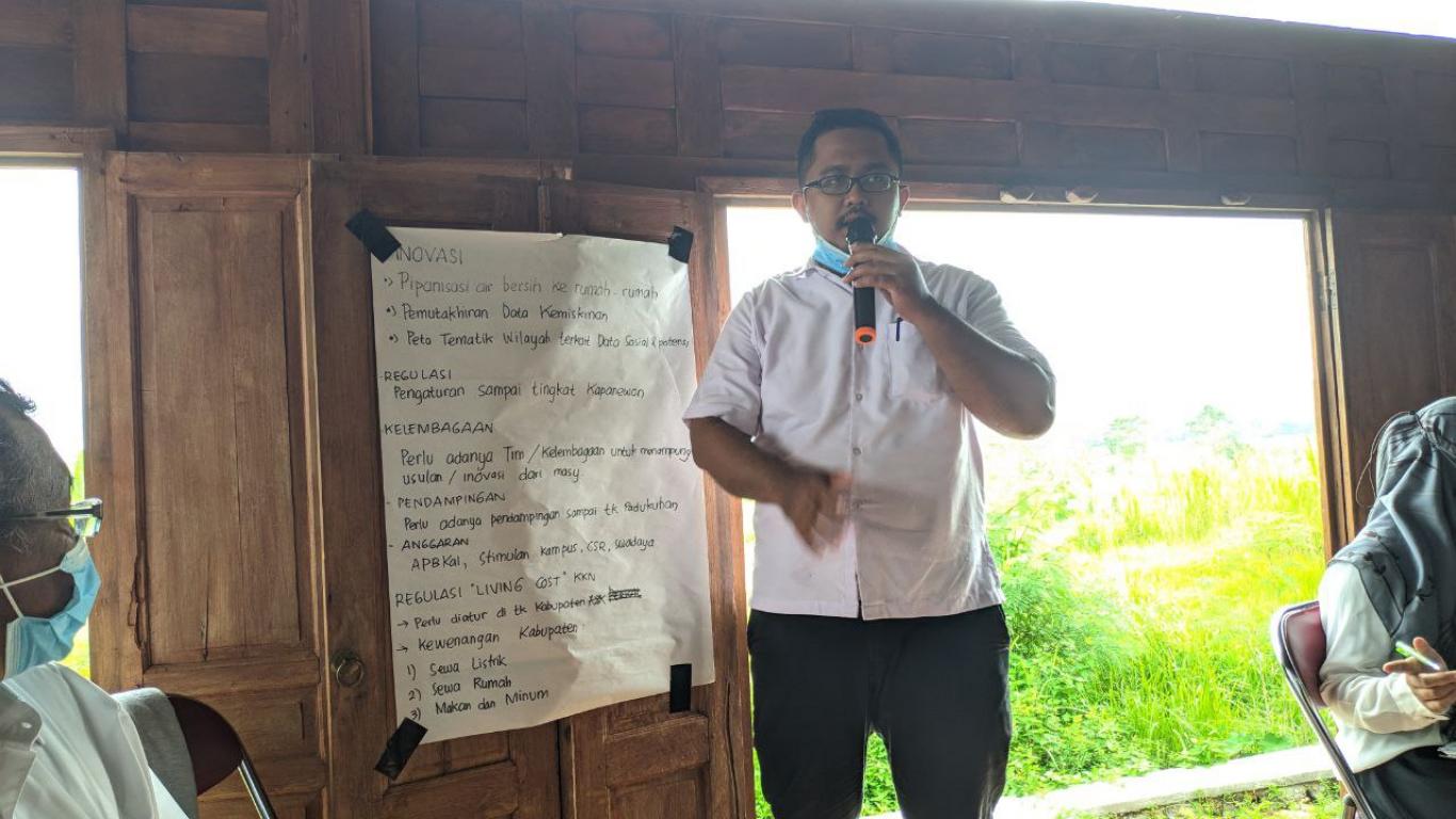 Dalam FGD ini dibentuk 4 kelompok kecil yang membahas 2 (dua) materi yaitu inovasi dan pembahasan regulasi living cost untuk mahasiswa KKN. kemudian memaparkan hasil diskusi tersebut didepan forum.
