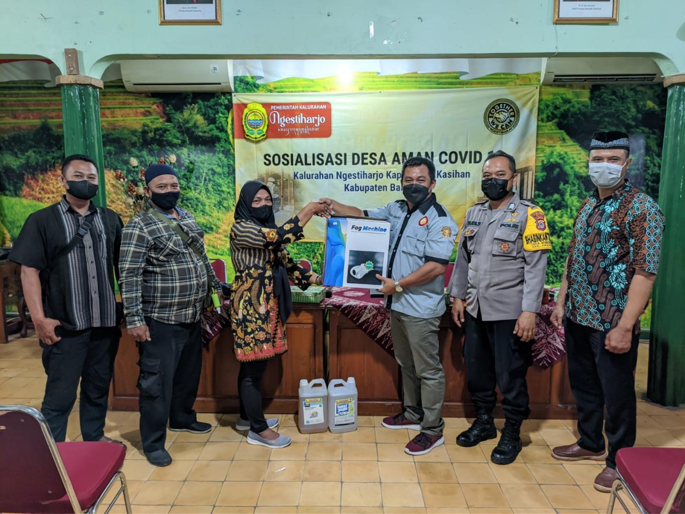 Sosialisasi ini menjelaskan kiat dan cara agar masyarakat Ngestiharjo aman dari Covid. Tiap Padukuhan di Ngestiharjo diberikan alat Fogging dan cairan Disinfektan untuk sterilisasi tempat maupun rumah warga.