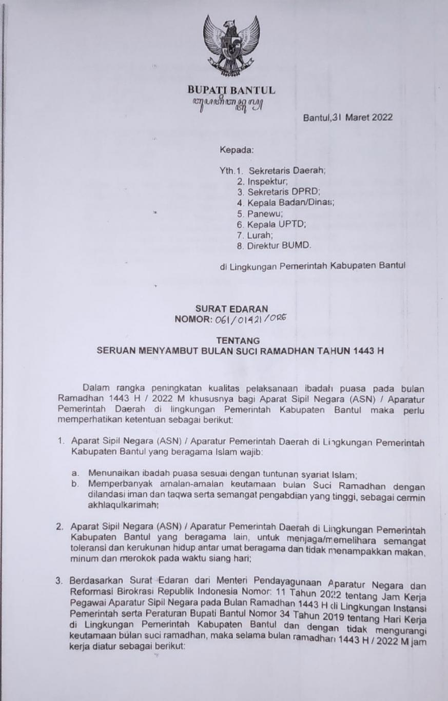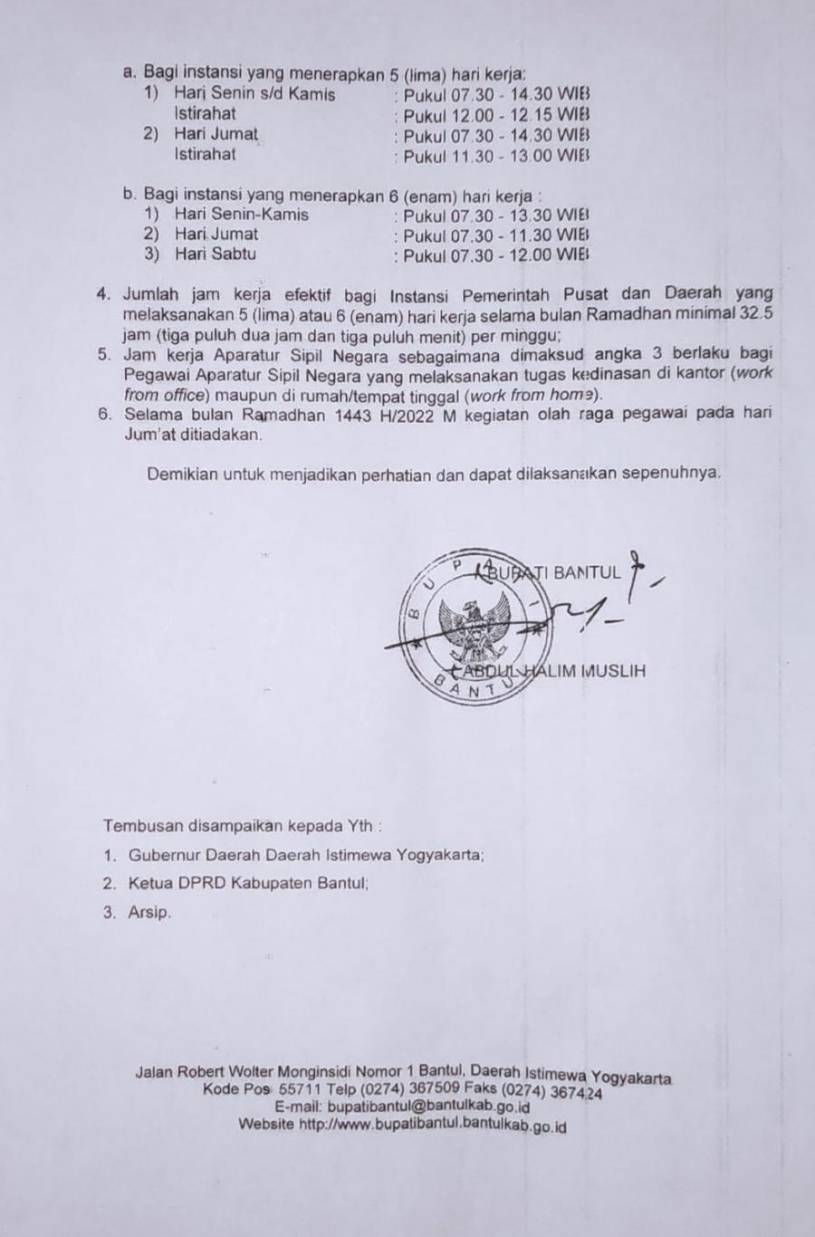 Sesuai dengan Surat Edaran Bupati Bantul Nomor 061/01421/ORG tentang Seruan Menyambut Bulan Suci Ramadan 1443 H. Terkait dengan jam pelayanan Kalurahan Ngestiharjo menyesuaikan Surat Edaran tersebut yaitu :