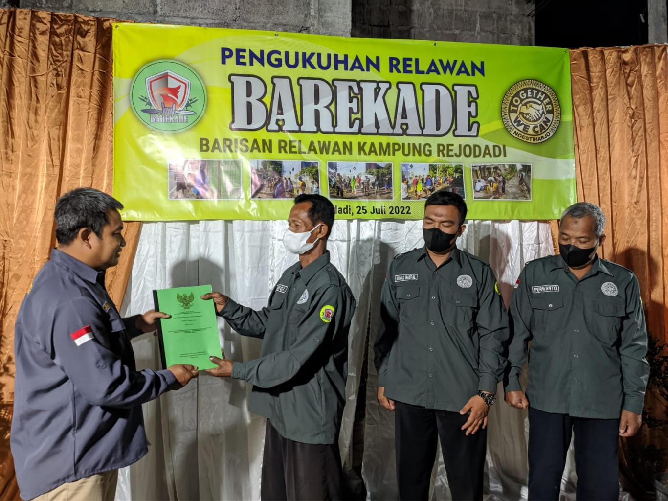 Rejodadi (26/07) Lurah Ngestiharjo menghadiri Pengukuhan Relawan BAREKADE Barisan Relawan Kampung Rejodadi Padukuhan Onggobayan, turut hadir dalam pengukuhan ini, perwakilan dari Kapolsek Kasihan, Babinsa Koramil 03, Kamituwo dan Perwakilan Ketua RT di Padukuhan Onggobayan.