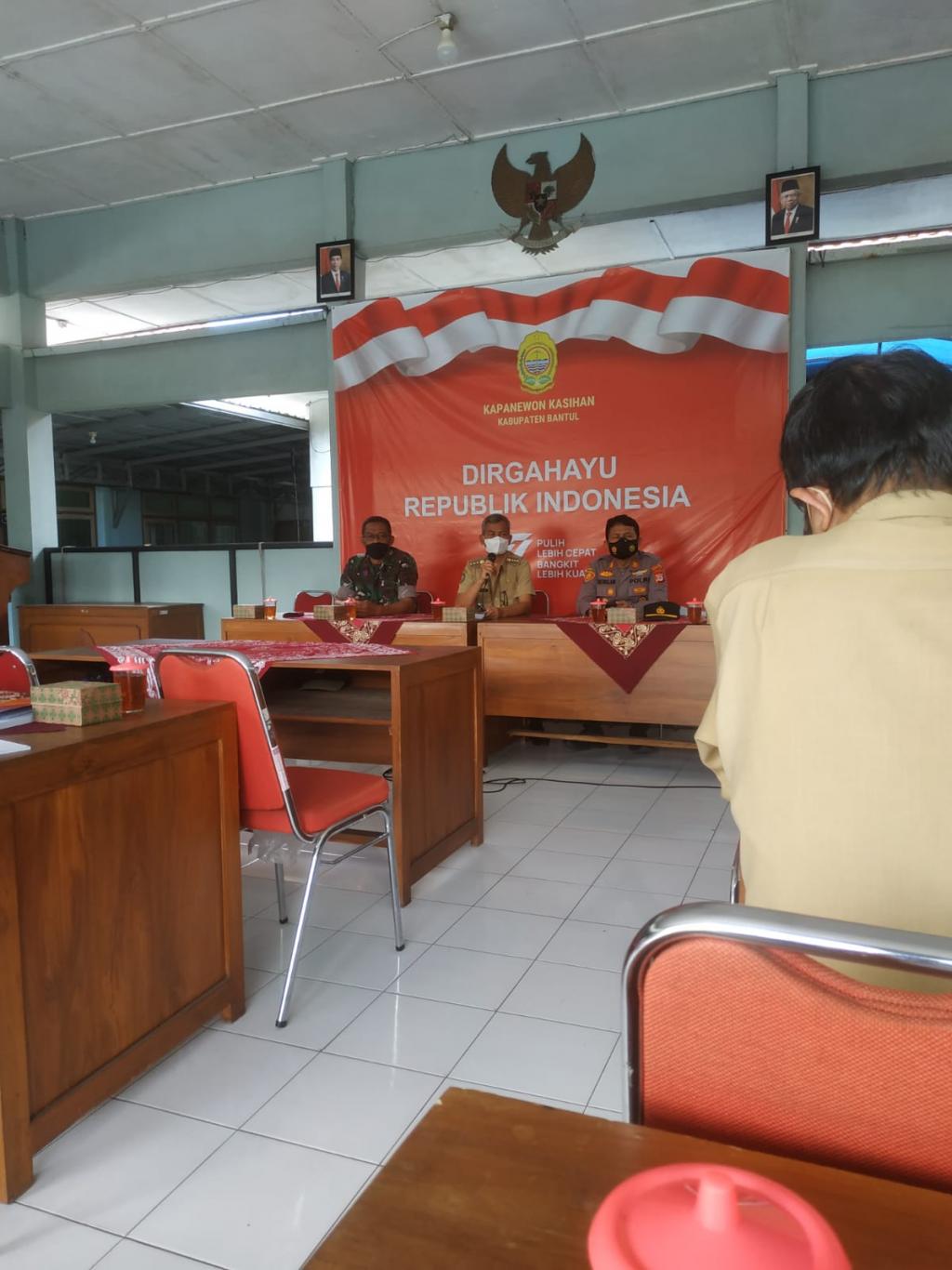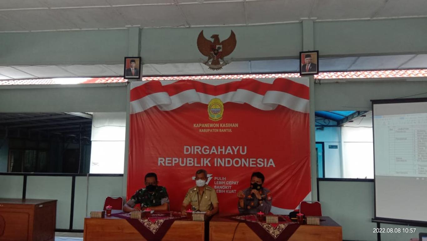 Tirtonirmolo (08/08) Staf Kamituwo menghadiri rapat koordinasi Pembentukan Panitia HUT RI Ke-77 di Pendopo Kapanewon Kasihan. Dalam rakor ini dibahas terkait pembagian panitia HUT sesuai dengan SK Panewu Kasihan yang terdiri dari karyawan Kapanewon Kasihan adan Kalurahan Tamantirto.