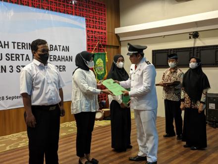 Surat Keputusan pengangkatan 3 staf Honorer diserahkan oleh Lurah Ngestiharjo kepada Oktaviani, Istiana dan Eko Purnomo.