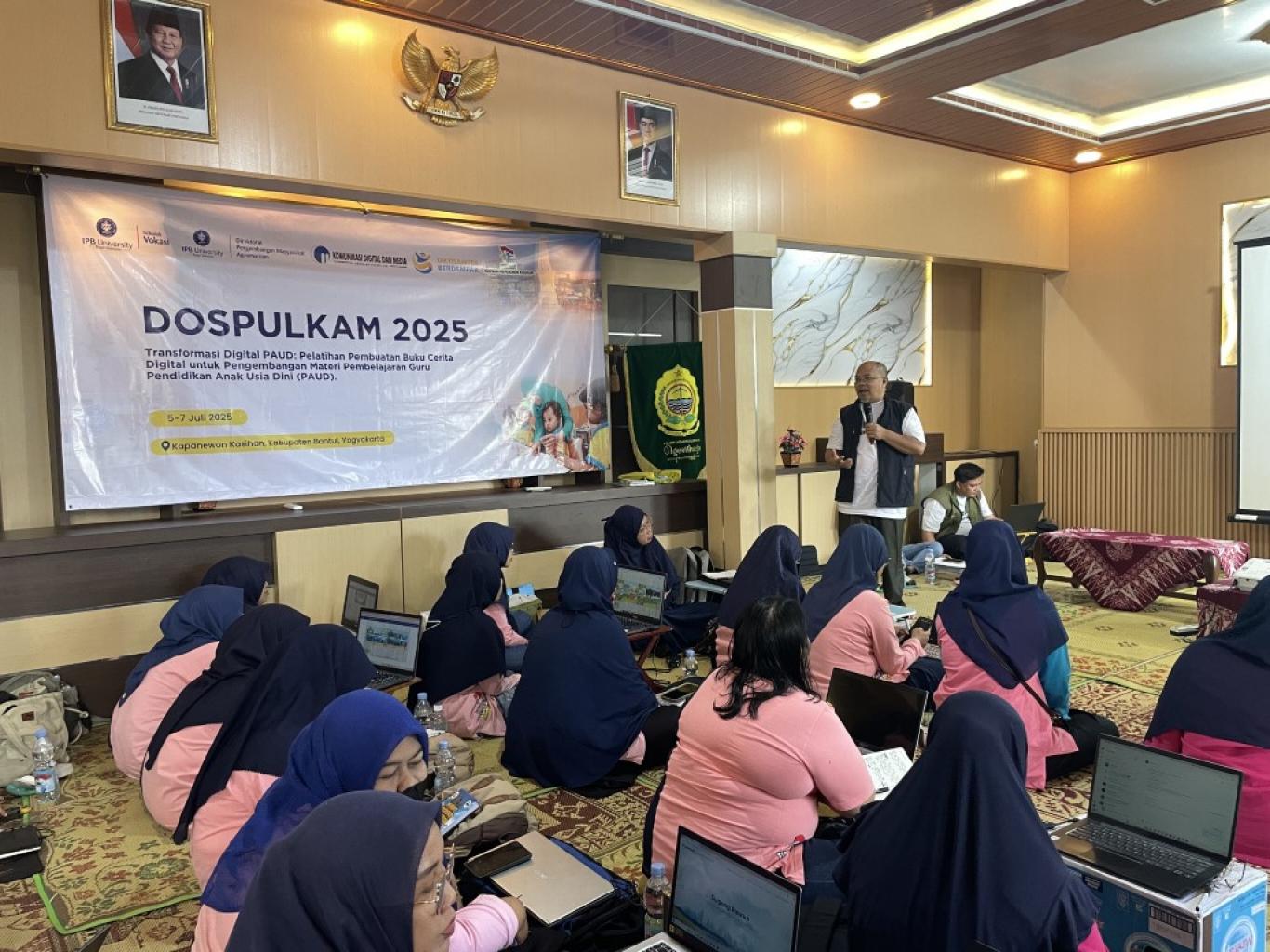 BANTUL – Program Studi Komunikasi Digital dan Media Sekolah Vokasi Institut Pertanian Bogor (SV IPB) menggelar pelatihan Transformasi Digital PAUD sebagai bagian dari program Dosen Pulang Kampung (Dospulkam) IPB 2025, yang dilaksanakan di Balai Kalurahan Ngestiharjo, Kapanewon Kasihan, Kabupaten Bantul.