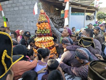 Di rumah Bapak Dukuh Sawahan, dilanjutkan acara sambutan dari Lurah Desa Pandowoharjo Sleman, lalu doa oleh Mbah Kaum Sawahan dan dilanjutkan rayahan Gunungan yang sudah dikirab.
