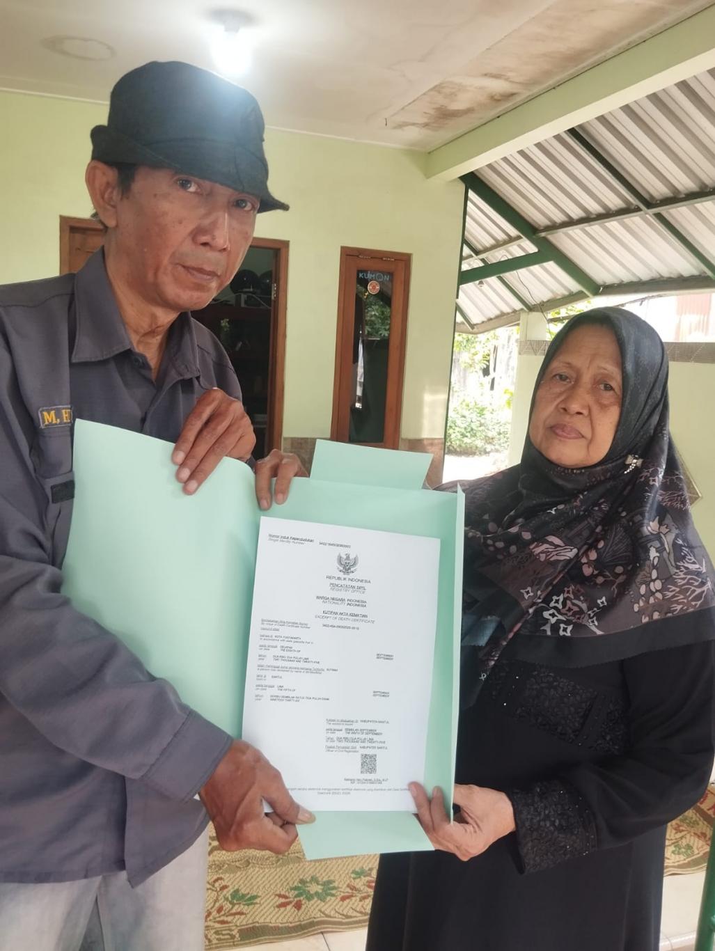 Penyerahan Akta Kematian kepada ahli waris Ibu Djumirah warga Padukuhan IX Sonopakis Lor RT 03.