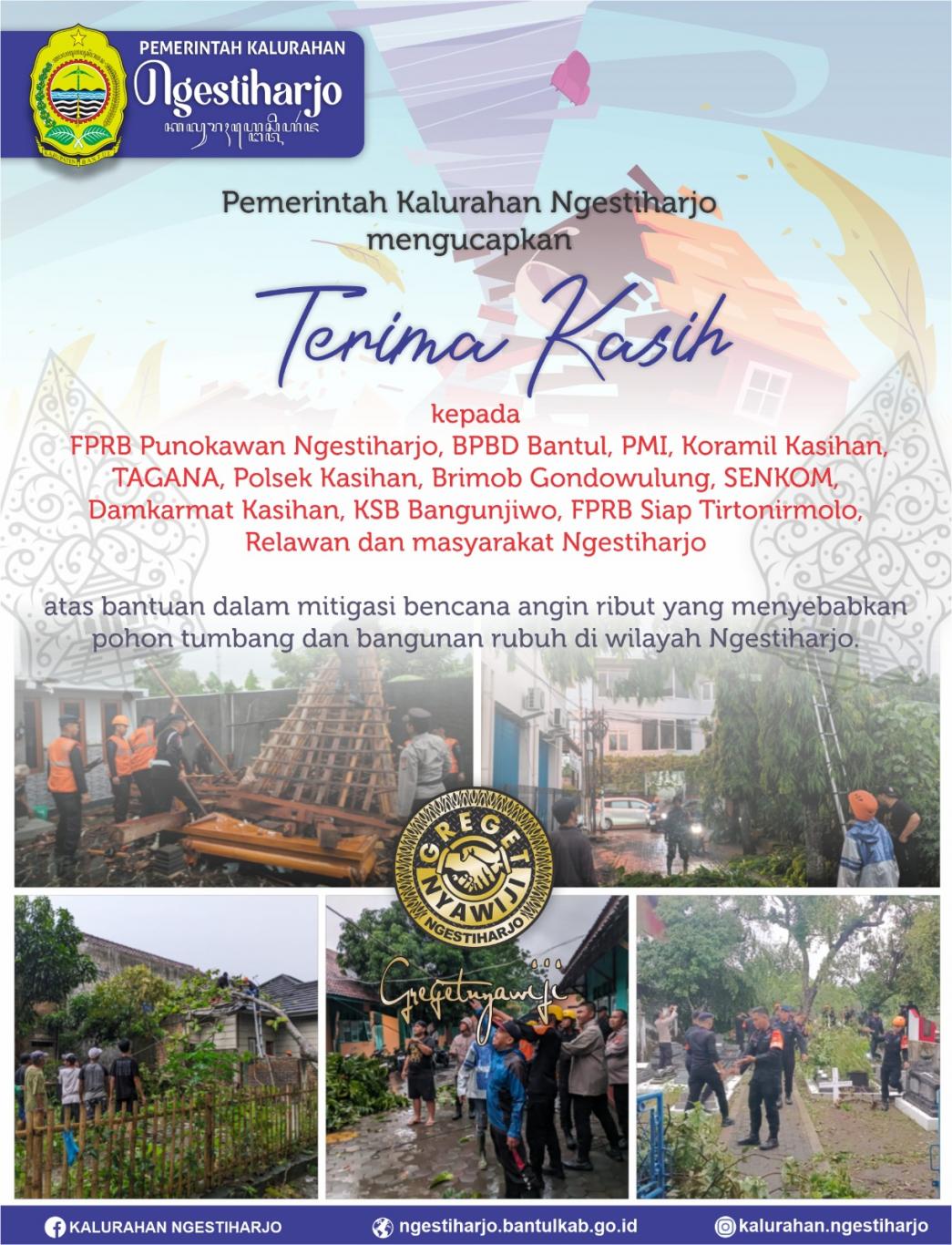 Pemerintah Kalurahan Ngestiharjo mengucapkan terima kasih atas bantuan relawan dalam mitigasi pohon dan bangunan rubuh akibat cuaca buruk yang terjadi pada Jumat, 31 Oktober 2025 Pukul 13.00