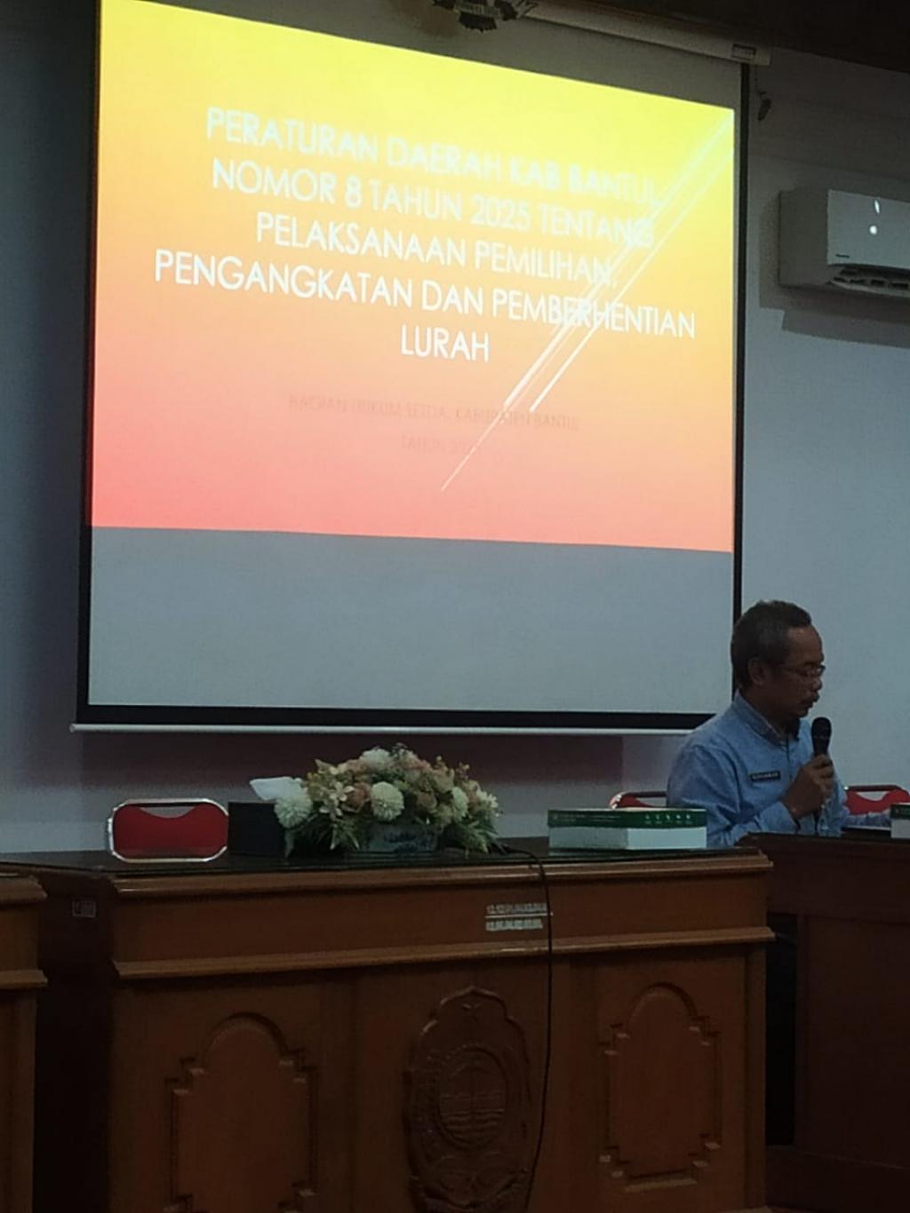 Bantul (18/11) Lurah dan Anggota Bamuskal Ngestiharjo menghadiri kegiatan Sosialisasi Peraturan Daerah Nomor 8 Tahun 2025 di Gedung Induk Lt.3 Komplek Parasamya Bantul. Kegiatan ini dihadiri oleh Kepala Bagian Hukum, Dinas PMK, Lurah, Kapanewon, dan Bamuskal se-Kabupaten Bantul. Kegiatan ini merupakan Sosialisasi Peraturan Daerah Kabupaten Bantul Nomor 8 Tahun 2025 tentang Pelaksanaan Pemilihan, Pengangkatan, dan Pemberhentian Lurah untuk 30 Kalurahan di tahun 2026.