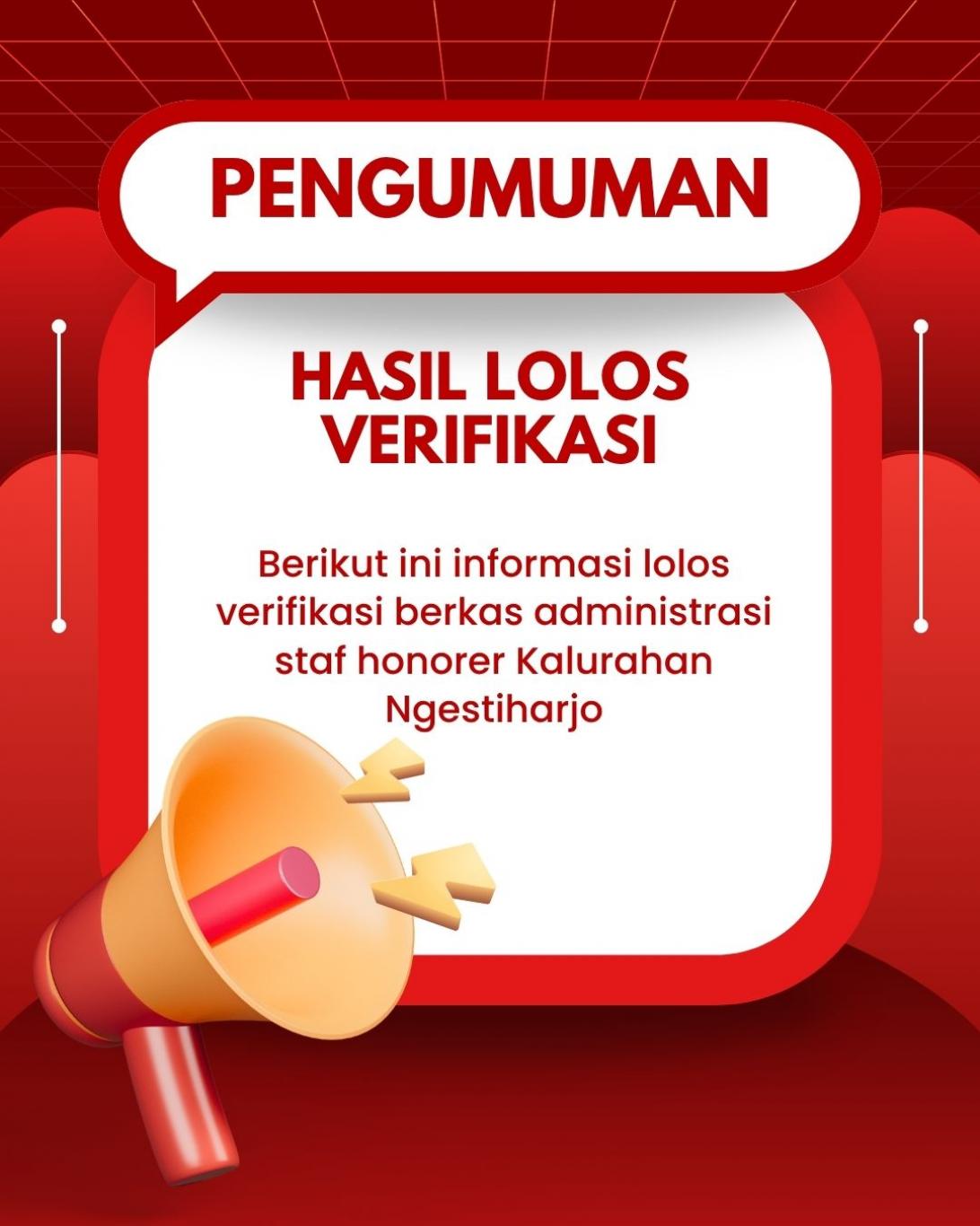 Sesuai dengan Surat Nomor B/400.10.2/00156 Perihal Hasil Verifikasi Berkas Administrasi Staf Honorer Kalurahan disampaikan kepada masyarakat Kalurahan Ngestiharjo by name yang lolos verifikasi berkas administrasi Staf Honorer Kalurahan adalah sebagai berikut :