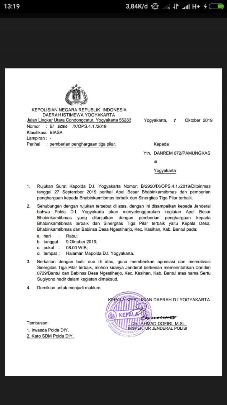 Lurah Desa Ngestiharjo Fathoni Aribowo, Bhabinkamtibmas Desa Ngestiharjo Bripka Budi Sunaryo, Babinsa Desa Ngestiharjo Sugiyono mendapatkan Penerimaan Reward Koordinasi 3 Pilar Terbaik se-DIY berdasarkan Rujukan Surat Kapolda DIY Nomor : B/2950/IX/OPS.4.1./2019/Ditbinmas tanggal 27 September 2019 perihal Apel Besar Bhabinkamtibmas dan pemberian penghargaan kepada Bhabinkamtibmasterbaik dam Sinergitas Tiga Pilar Terbaik....