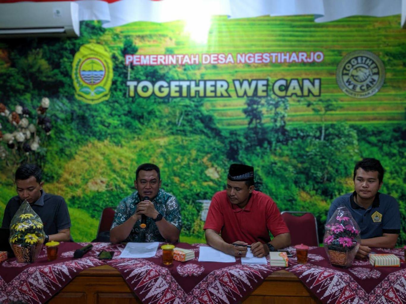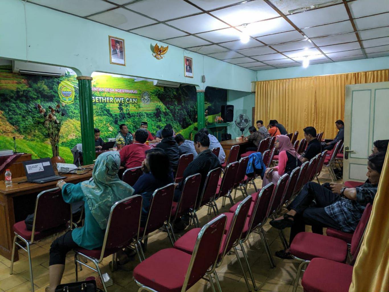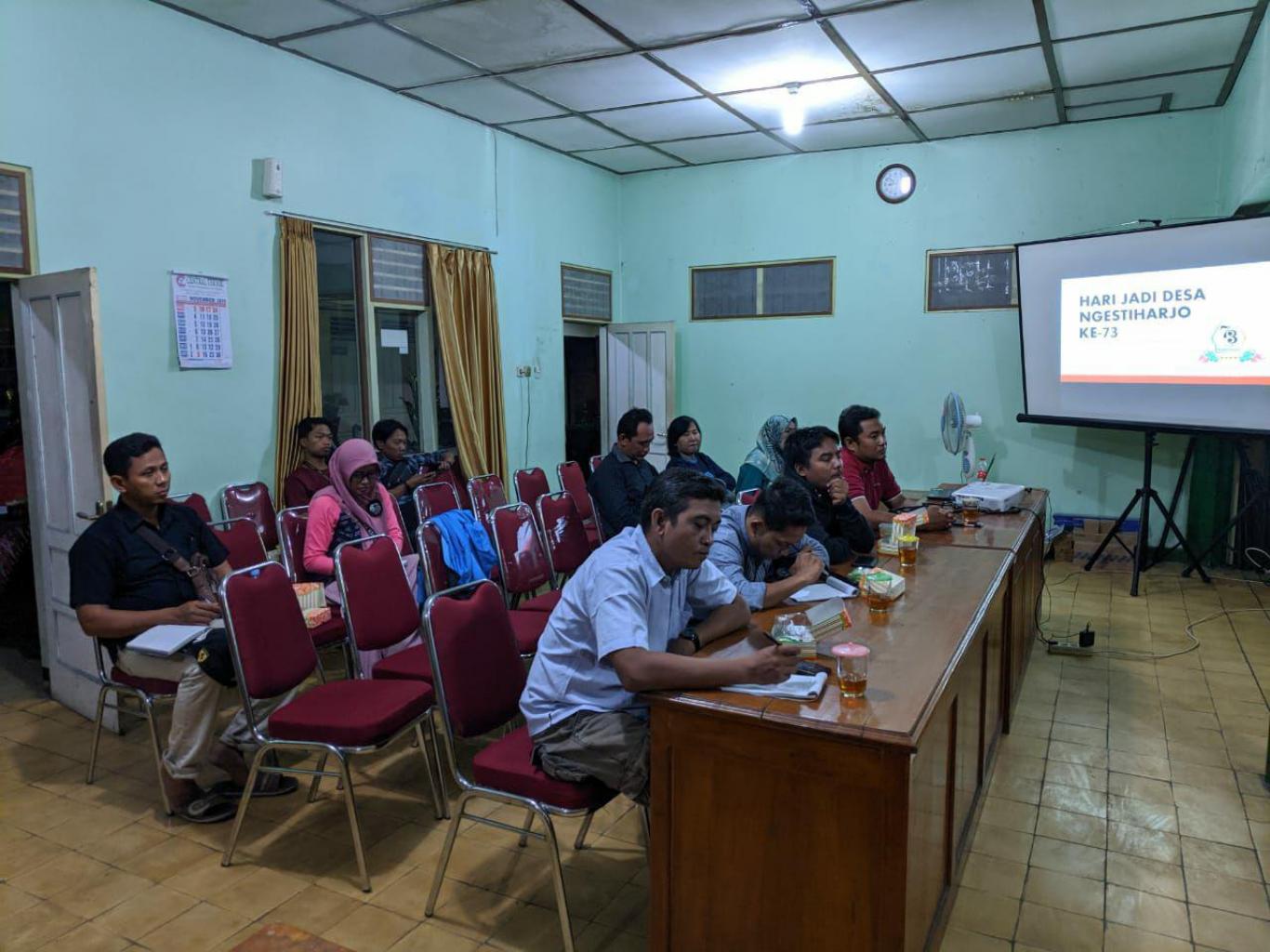 Ngestiharjo (8/11) Pemerintah Desa Ngestiharjo mengadakan rapat persiapan pelaksanaan Hari Jadi Desa ke 73 di Aula Desa Ngestiharjo. Rapat ini di pimpin langsung oleh Lurah Desa Ngestiharjo, di hadiri oleh seluruh pamong desa beserta undangan yang berasal dari komponen LKD dan komuntas-komunitas yang ada di pedukuhan. Pembahasan pada malam ini adalah pembagian tugas sesuai dengan kelompoknya berdasarkan dari kepanitiaan yang telah di sebutkan dan di bentuk. Dalam rencana kegiatan yang di sampaikan oleh Ketua Panitia Toto Amrih Susilo, ada 3 hari pelaksanaan dari tanggal 15 - 17 November 2019. Pelaksanaan kegiatan akan di bantu oleh tiap bagian panita yang telah di paparkan pada rapat.